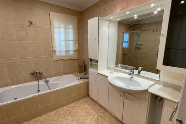 Descending to the lower level, you'll discover two more bedrooms with fitted wardrobes, a generously sized family bathroom complete with a bathtub and separate shower, an office, and two storage rooms. From this level, direct access is provided to the private heated pool and inviting garden area.