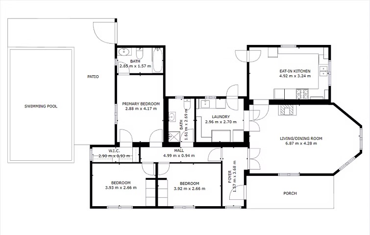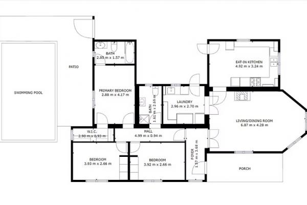 The house comprises 3 bedrooms and 2 bathrooms (1 full bathroom and 1 shower room), a large kitchen, a separate pantry/laundry room with an enclosed patio behind it, and a spacious living-dining room.